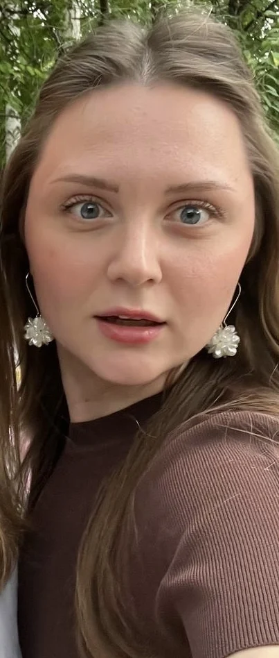 Pair of floral earrings on a brown jewelry box with a soft fabric background