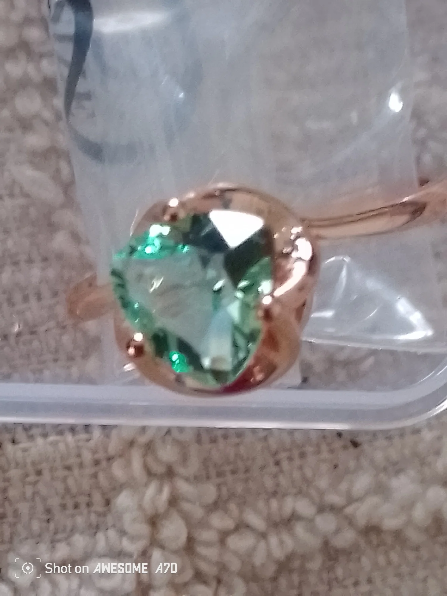 Rose gold ring with a heart-shaped green gemstone on a white background